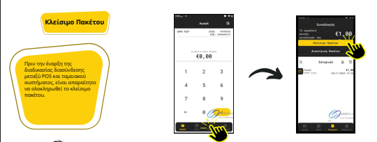 Πριν ξεκινήσει η διαδικασία διασύνδεσης μεταξύ POS και ταμειακού συστήματος, πρέπει να ολοκληρωθεί το κλείσιμο πακέτου μέσα από την εφαρμογή.