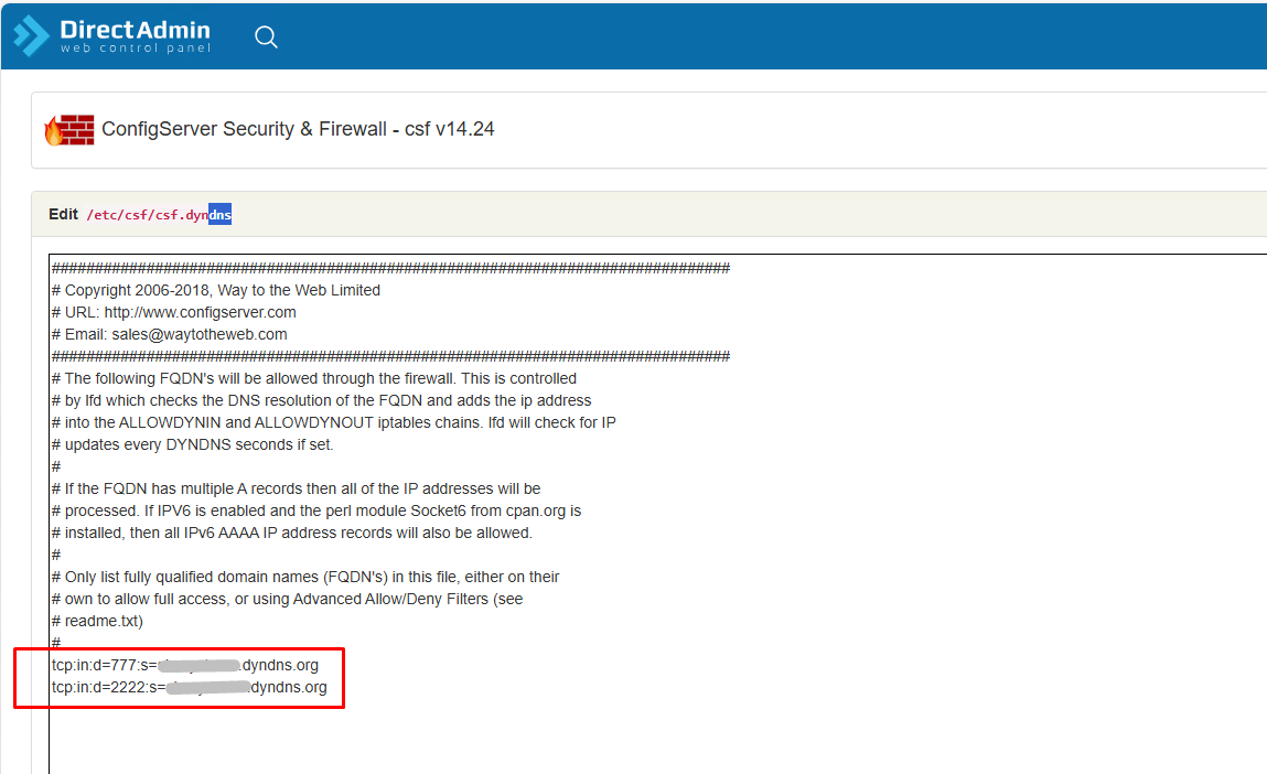 Εκεί επεξεργάζεσαι το αρχείο /etc/csf/csf.dyndns.