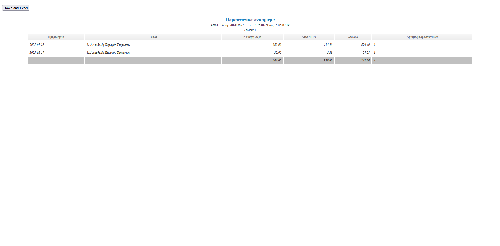- Το ως άνω λογισμικό, κατόπιν εισαγωγής των απαραίτητων παραμέτρων χρονικού εύρους, παρουσιάζει μια συνολική και λεπτομερή αναφορά για όλα τα εκδοθέντα παραστατικά. Μπορούμε να δούμε με ακρίβεια τα ποσά καθαρής αξίας ανά κατηγορία ΦΠΑ, τα αντίστοιχα ποσά του φόρου ΦΠΑ και το συνολικό ποσό για κάθε κατηγορία.