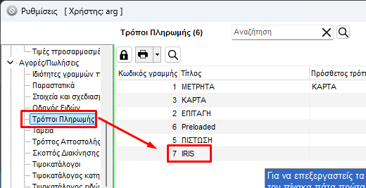 Στις ⚙️Ρυθμίσεις-> Τρόπους Πληρωμής της EMDI θα πρέπει να υπάρχει ένας τρόπος πληρωμής με περιγραφή IRIS: