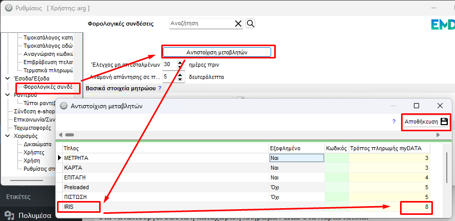 Επιπλέον, πάω στις Φορολογικές Συνδέσεις-> Αντιστοίχιση Μεταβλητών και βάζω το κωδικό 8 στο IRIS.