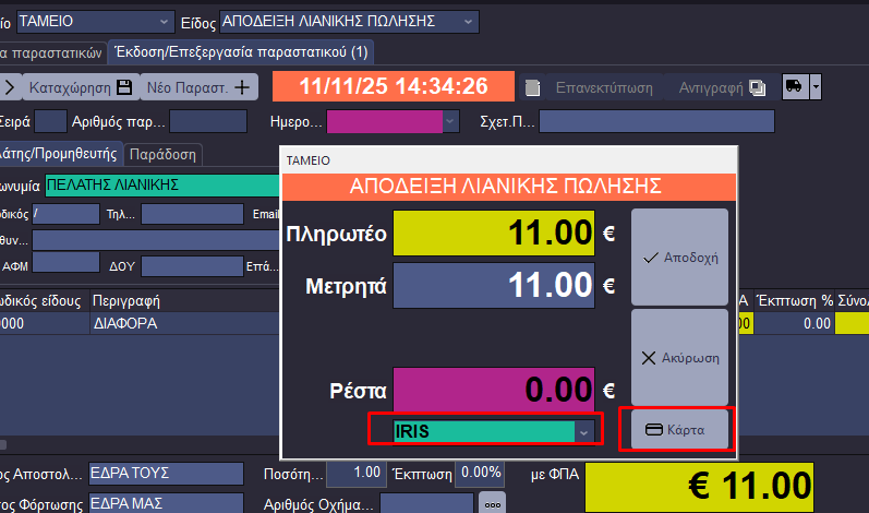αλλά στο παραστατικό της EMDI η πληρωμή εμφανίζεται με τρόπο πληρωμής IRIS, όπως έχει επιλεγεί από τον χρήστη.