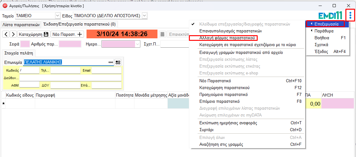 Για να ενεργοποιήσεις τη δυνατότητα επιλογής φόρμας κατά την έκδοση ή επανεκτύπωση παραστατικού, στις αγορές/πωλήσεις 🔴 πατάς επιλογές πάνω δεξιά (τρεις τελείες) και από εκεί διαλέγεις επεξεργασία και επιλέγεις το αλλαγή φόρμας παραστατικού.