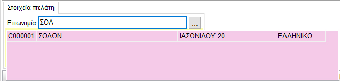 Για να αναζητήσεις το όνομα του προσώπου ή της εταιρίας, πληκτρολογείς στο πεδίο ΕΠΩΝΥΜΙΑ τα τρία πρώτα γράμματα του ονόματος, του επωνύμου ή της επωνυμίας και το εμπορικό πρόγραμμα ξεκινά την αναζήτηση. Εναλλακτικά, μπορείς να πατήσεις το πλήκτρο με τις τρεις τελείες δίπλα στο πεδίο ΕΠΩΝΥΜΙΑ και η καρτέλα ΠΕΛΑΤΕΣ/ΠΡΟΜΗΘΕΥΤΕΣ ανοίγει, ώστε να επιλέξεις από τη λίστα σου.