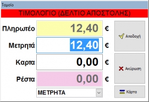 Αμέσως εμφανίζεται μπροστά σου το παράθυρο ΤΑΜΕΙΟΥ, όπου αφού ελέγξεις το τελικό ποσό, επιλέγεις ΑΠΟΔΟΧΗ για να εκδόσεις το παραστατικό ή ΑΚΥΡΩΣΗ, αν θες να πραγματοποιήσεις διορθώσεις.