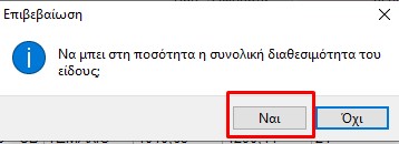 Τέλος πατάμε εισαγωγή και στο ερώτημα “Να μπει στη ποσότητα η συνολική διαθεσιμότητα του είδους;”, επιλέγουμε Ναι