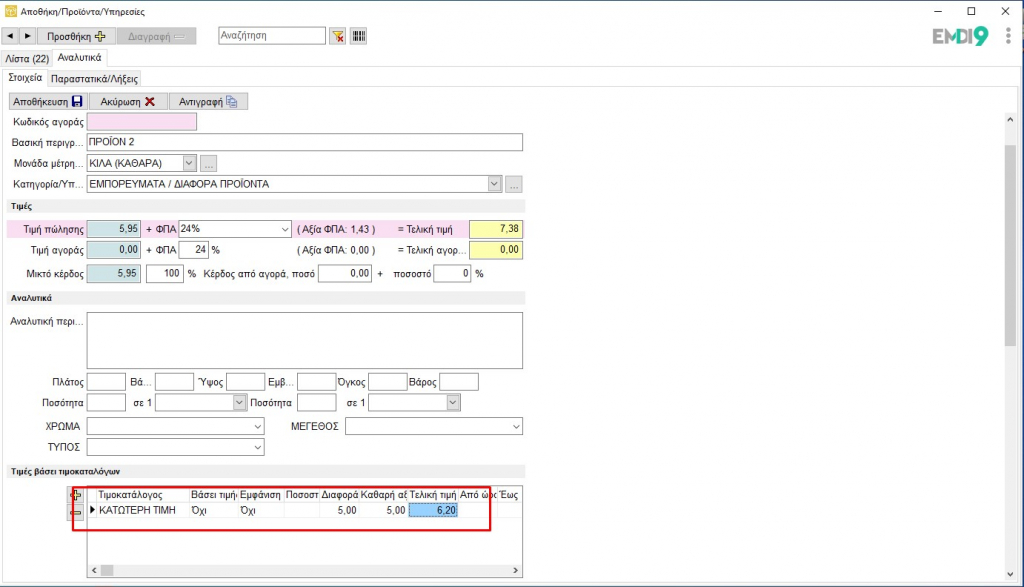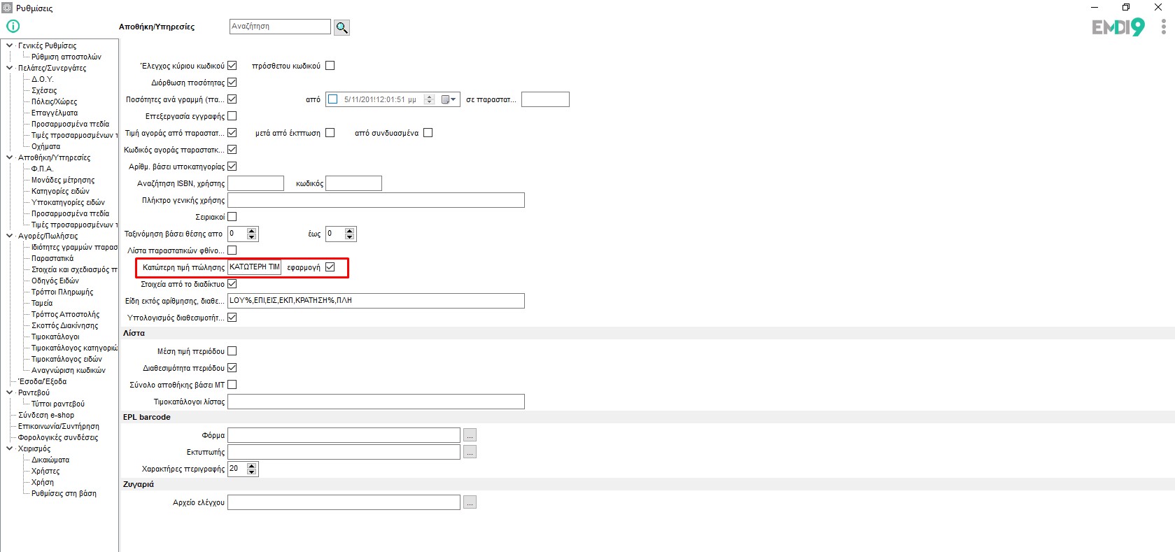 Στην EMDI υπάρχει η δυνατότητα ορισμού κατώτατης τιμής πώλησης. Με αυτό το τρόπο όταν δημιουργείται παραστατικό και πάμε να αλλάξουμε τη τιμή από ένα είδος υπάρχει ενημέρωση όταν η τιμή που δίνουμε είναι κατώτερη της ορισμένης.