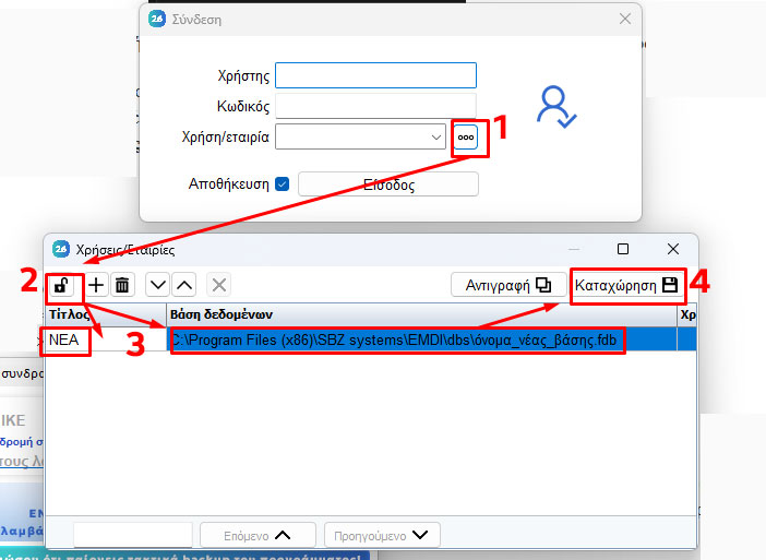 Έπειτα, θα εμφανιστεί ένα παράθυρο στο οποίο θα παρατηρήσετε στο πεδίο”Χρήση/Εταιρία” ένα κουτάκι με 3 τελείες. 1. Πατάμε το κουτάκι ώστε να προσθέσουμε τη νέα μας βάση ή και την παλιά αν είναι η 1η φορά που δημιουργώ νέα χρήση. 2. Ξεκλειδώνω 🔒->🔓, 3. Στο πεδίο βάση δεδομένων, βάζω το path της νέας βάσης, και αν είναι η πρώτη φορά, πατάω το + για να προσθέσω και τη παλιά αν θέλω, στο Τίτλος, βάζω ένα όνομα για να θυμάμαι-ξεχωρίζω ποια βάση είναι ποια. 4. Αφού σιγουρευτώ ότι όλα είναι σωστα, πατάω Καταχώρηση💾.