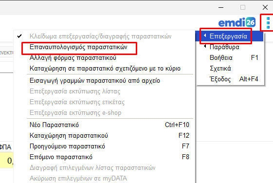 - Αγορές/Πωλήσεις 🔴-> (3 τελείες) επεξεργασία-> επανυπολογισμός παραστατικών,