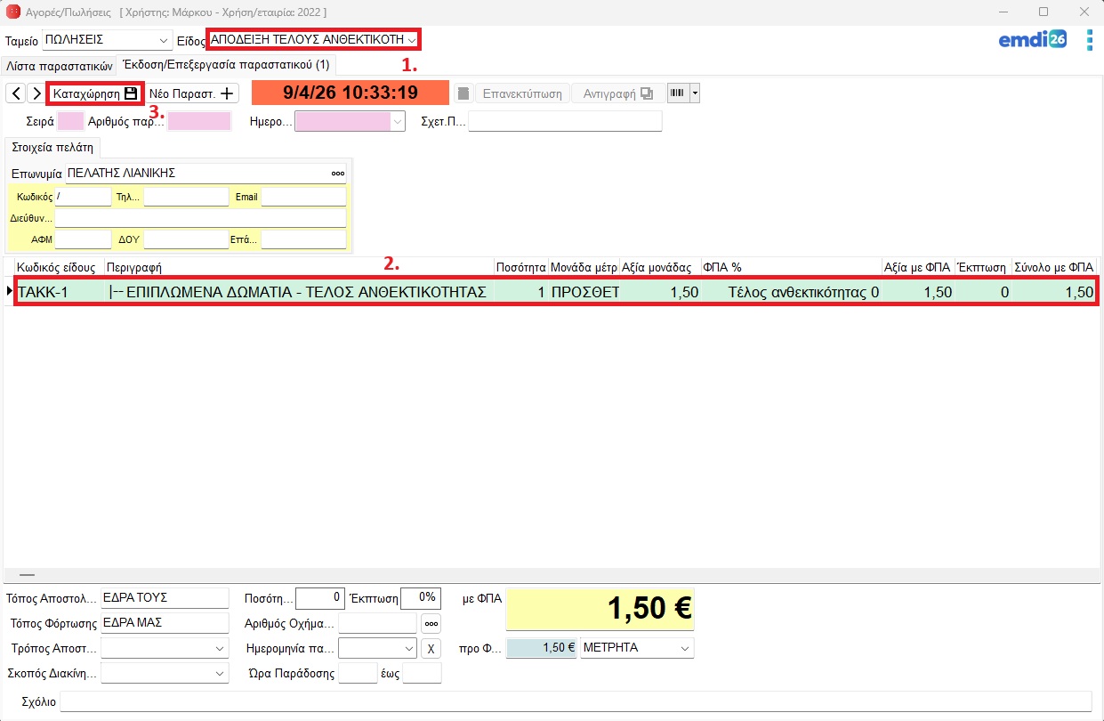 Τέλος για να τιμολογήσουμε το συγκεκριμένο προιόν πηγαίνουμε στην “Αποθήκη” και επιλέγουμε το συγκεκριμένο προιον. Επιλέγουμε το συγκεκριμένο ΦΠΑ και πατάμε αποθήκευση.