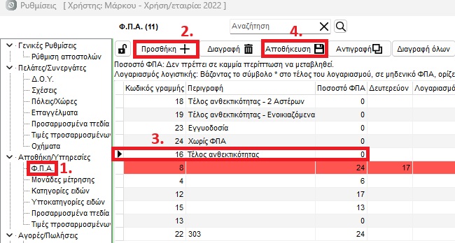Αρχικά πηγαίνουμε στις ρυθμίσεις(γκρι) και επιλέγουμε το “ΦΠΑ”, ξεκλειδώνουμε πατάμε “Προσθήκη” πληκτρολογούμε τον τίτλο και το ποσοστό του ΦΠΑ και πατάμε “Αποθήκευση”.