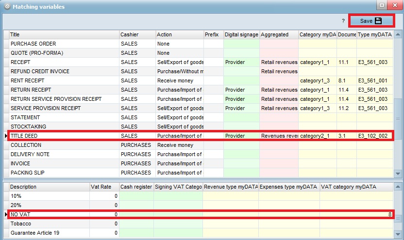 Post published:30/03/2026 Post category:Accounting / Reports / Settings In the settings -> Tax connections -> Matching Variables we set up the documents we use as a title of ownership. The VAT of the document should be set as “Registrations without VAT”. Tags: gsis, Issuance of a document, myDATA, taxis, Αντιστοιχίες myData, δημιουργία παραστατικού, Έκδοση παραστατικού, Ρύθμιση παραστατικών, Τιμολόγιο Αγοράς απο Ιδιώτη