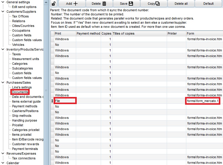 4. Configuration of the retail form must be “form_mercato.1” and Print must be strictly set to “File”*.