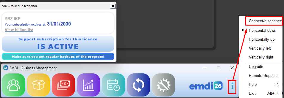 On the EMDI menu bar, click the three dots and select “Connect/Disconnect”.