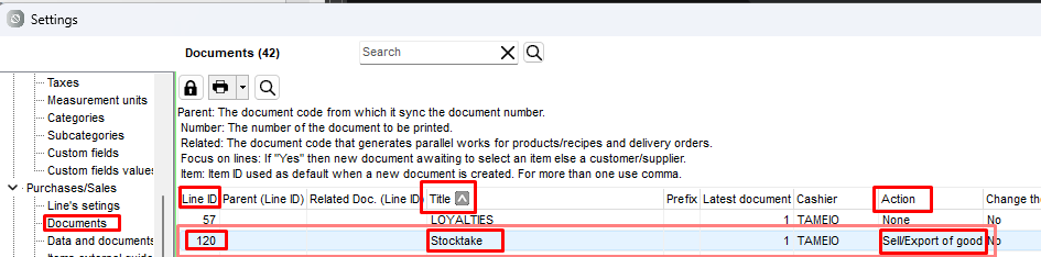 Document Setup: Go to Settings ⚙️ -> Documents. Ensure that the inventory document (e.g., 120 – Stocktake) is set to “Sale/Export of goods” and “Show prices: Yes”.