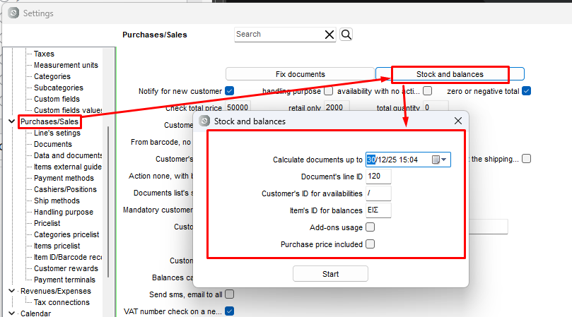Execution: Go to Settings -> Purchases/Sales -> Stock and Balances.