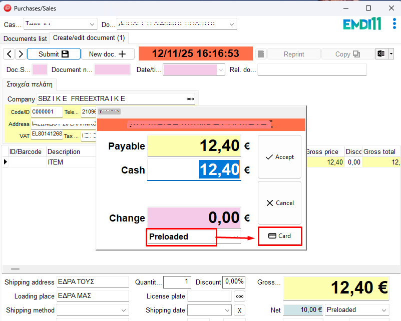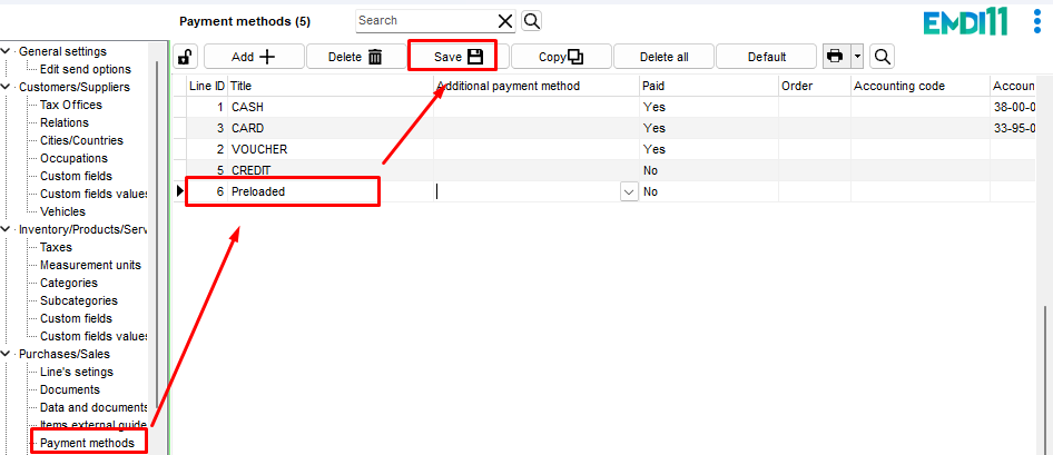 In EMDI, when connected to the e-invoicing provider services, you can configure one or more card terminals to support preloaded transactions.