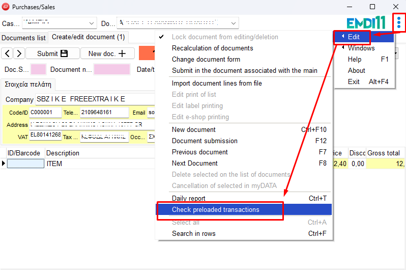To check the terminal status, go to the three dots next to the EMDI logo (top right) → Edit → Check Preloaded Transactions. This will show any pending or completed preloaded transactions on the terminal.